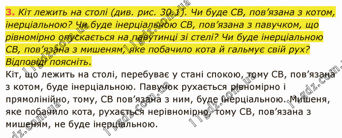Кіт лежить на столі (див. рис. 30.1). Чи буде СВ, пов’язана з котом, інерціальною? Чи буде інерціальною СВ, пов’язана з павучком, що рівномірно опускається на павутинці зі стелі? Чи буде інерціальною СВ, пов’язана з мишеням, яке побачило кота й гальмує свій рух? Відповіді поясніть. Кіт, що лежить на столі, перебуває у стані спокою, тому СВ, пов’язана з котом, буде інерціальною. Павучок рухається рівномірно і прямолінійно, тому, СВ пов’язана з ним, буде інерціальною. Мишеня, яке побачило кота, рухається нерівномірно, тому СВ, пов’язана з мишеням, не буде інерціальною.