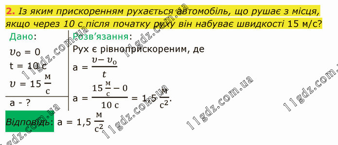 Із яким прискоренням рухається автомобіль, що рушає з місця, якщо через 10 с після початку руху він набуває швидкості 15 м/с?