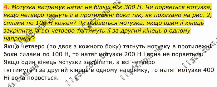Мотузка витримує натяг не більш ніж 300 Н. Чи порветься мотузка, якщо четверо тягнуть її в протилежні боки так, як показано на рис. 2, силами по 100 Н кожен? Чи порветься мотузка, якщо один її кінець закріпити, а всі четверо тягтимуть її за другий кінець в одному напрямку? Якщо четверо (по двоє з кожного боку) тягнуть мотузку в протилежні боки силами по 100 Н, то натяг мотузки 200 Н і вона не порветься. Якщо один кінець мотузки закріпити, а всі четверо тягтимуть її за другий кінець в одному напрямку, то натяг мотузки 400 Ні вона порветься.