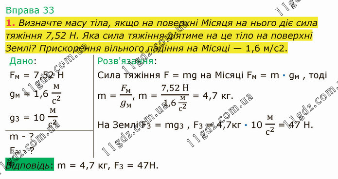 Визначте масу тіла, якщо на поверхні Місяця на нього діє сила тяжіння 7,52 Н. Яка сила тяжіння діятиме на це тіло на поверхні Землі? Прискорення вільного падіння на Місяці — 1,6 м/с2.