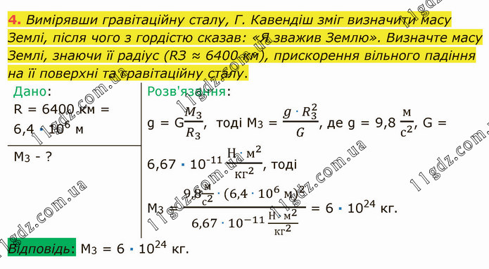 Вимірявши гравітаційну сталу, Г. Кавендіш зміг визначити масу Землі, після чого з гордістю сказав: «Я зважив Землю». Визначте масу Землі, знаючи її радіус (RЗ ≈ 6400 км), прискорення вільного падіння на її поверхні та гравітаційну сталу.