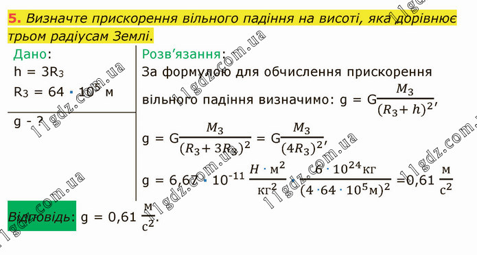 Визначте прискорення вільного падіння на висоті, яка дорівнює трьом радіусам Землі.