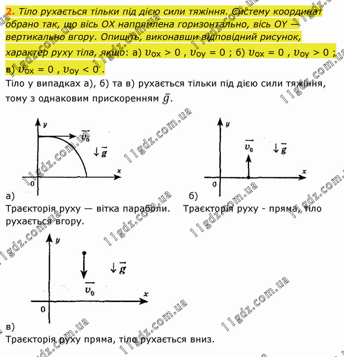 Тіло рухається тільки під дією сили тяжіння. Систему координат обрано так, що вісь ОХ напрямлена горизонтально, вісь ОY — вертикально вгору. Опишіть, виконавши відповідний рисунок, характер руху тіла, якщо: а) υoх > 0 , υoy = 0 ; б) υoх = 0 , υoy > 0 ; в) υoх = 0 , υoy < 0 .