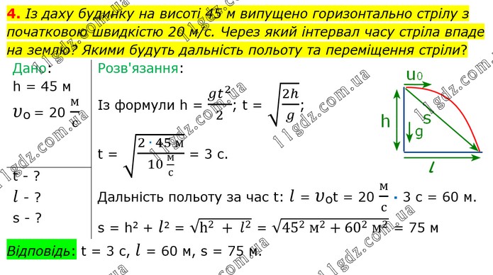 Із даху будинку на висоті 45 м випущено горизонтально стрілу з початковою швидкістю 20 м/с. Через який інтервал часу стріла впаде на землю? Якими будуть дальність польоту та переміщення стріли? Дано: h = 45 м υo = 20 м/с t - ? l - ? s - ? Розв'язання: Із формули h = (gt^2)/2; t = √(2h/g); t = √((2 ∙ 45 м)/(10 м/с)) = 3 c. Дальність польоту за час t: l = υot = 20 м/с ∙ 3 c = 60 м. s = h2 + l2 = √(h^2 + l^2 ) = √(45^2 м^2+60^2 м^2 ) = 75 м t - ? l - ? s - ? Відповідь: t = 3 c, l = 60 м, s = 75 м.