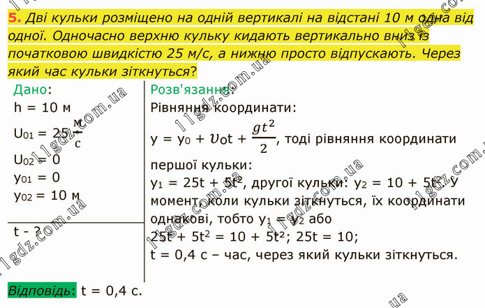 Дві кульки розміщено на одній вертикалі на відстані 10 м одна від одної. Одночасно верхню кульку кидають вертикально вниз із початковою швидкістю 25 м/с, а нижню просто відпускають. Через який час кульки зіткнуться?
