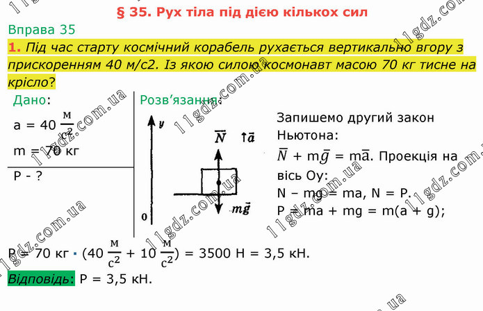 Під час старту космічний корабель рухається вертикально вгору з прискоренням 40 м/с2. Із якою силою космонавт масою 70 кг тисне на крісло?