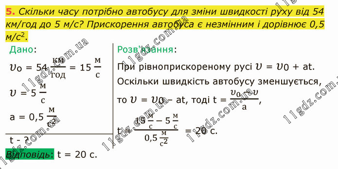 Скільки часу потрібно автобусу для зміни швидкості руху від 54 км/год до 5 м/с? Прискорення автобуса є незмінним і дорівнює 0,5 м/с2.