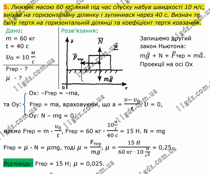 Лижник масою 60 кг, який під час спуску набув швидкості 10 м/с, виїхав на горизонтальну ділянку і зупинився через 40 с. Визнач те силу тертя на горизонтальній ділянці та коефіцієнт тертя ковзання.