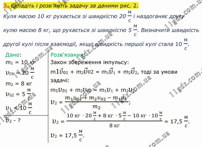Складіть і розв’яжіть задачу за даними рис. 2. Куля масою 10 кг рухається зі швидкістю 20 м/с і наздоганяє другу кулю масою 8 кг, що рухається зі швидкістю 5 м/с. Визначити швидкість другої кулі після взаємодії, якщо швидкість першої кулі стала 10 м/с