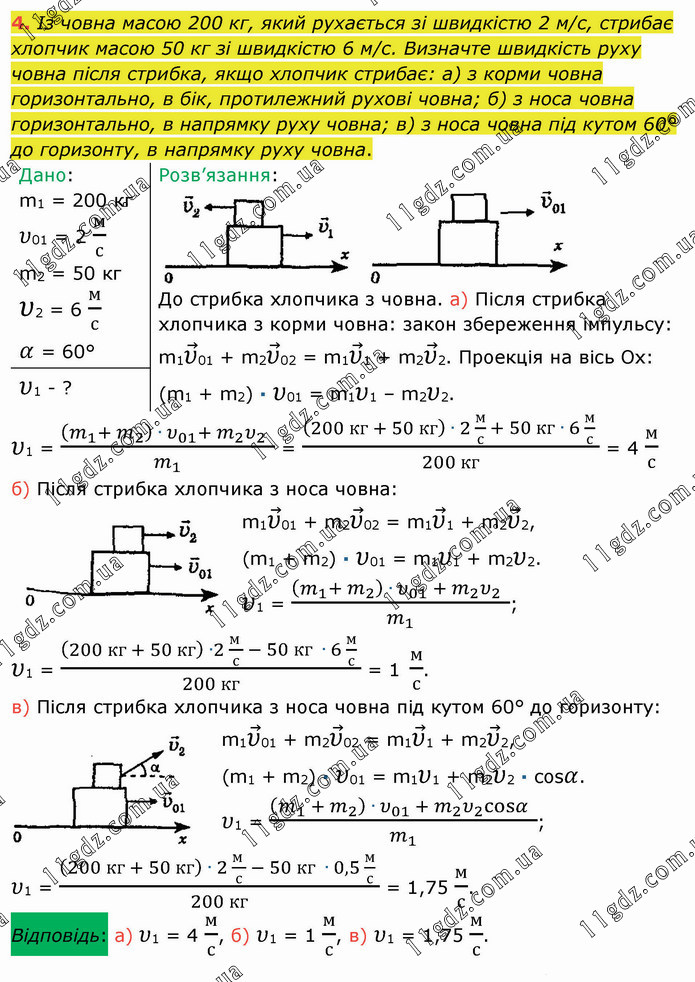 Із човна масою 200 кг, який рухається зі швидкістю 2 м/с, стрибає хлопчик масою 50 кг зі швидкістю 6 м/с. Визначте швидкість руху човна після стрибка, якщо хлопчик стрибає: а) з корми човна горизонтально, в бік, протилежний рухові човна; б) з носа човна горизонтально, в напрямку руху човна; в) з носа човна під кутом 60° до горизонту, в напрямку руху човна.
