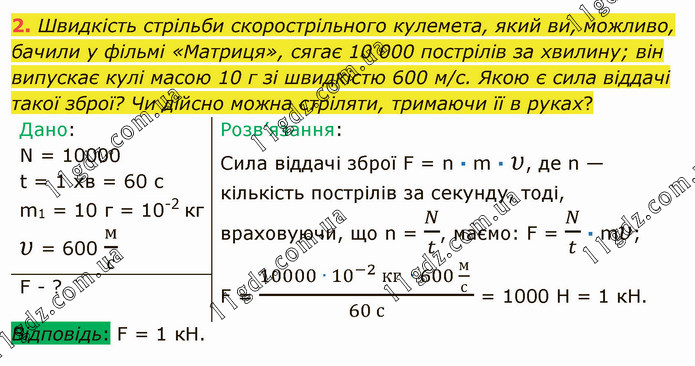 Швидкість стрільби скорострільного кулемета, який ви, можливо, бачили у фільмі «Матриця», сягає 10 000 пострілів за хвилину; він випускає кулі масою 10 г зі швидкістю 600 м/с. Якою є сила віддачі такої зброї? Чи дійсно можна стріляти, тримаючи її в руках?