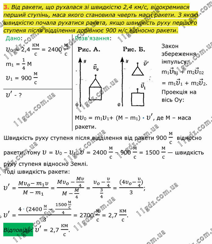 Від ракети, що рухалася зі швидкістю 2,4 км/с, відокремився перший ступінь, маса якого становила чверть маси ракети. З якою швидкістю почала рухатися ракета, якщо швидкість руху першого ступеня після відділення дорівнює 900 м/с відносно ракети.