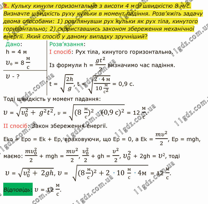 Кульку кинули горизонтально з висоти 4 м зі швидкістю 8 м/с. Визначте швидкість руху кульки в момент падіння. Розв’яжіть задачу двома способами: 1) розглянувши рух кульки як рух тіла, кинутого горизонтально; 2) скориставшись законом збереження механічної енергії. Який спосіб у даному випадку зручніший?