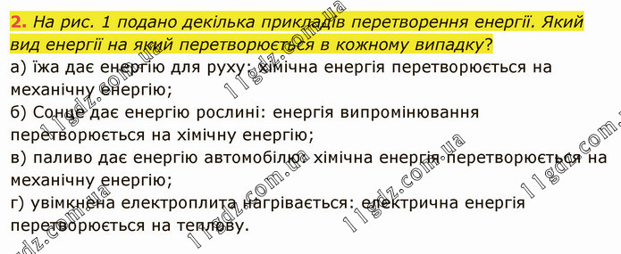 На рис. 1 подано декілька прикладів перетворення енергії. Який вид енергії на який перетворюється в кожному випадку? а) їжа дає енергію для руху: хімічна енергія перетворюється на механічну енергію; б) Сонце дає енергію рослині: енергія випромінювання перетворюється на хімічну енергію; в) паливо дає енергію автомобілю: хімічна енергія перетворюється на механічну енергію; г) увімкнена електроплита нагрівається: електрична енергія перетворюється на теплову.