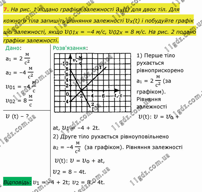 На рис. 1 подано графіки залежності ах(t) для двох тіл. Для кожного тіла запишіть рівняння залежності υх(t) і побудуйте графік цієї залежності, якщо υ01х = −4 м/с, υ02х = 8 м/с. На рис. 2 подано графіки залежності.
