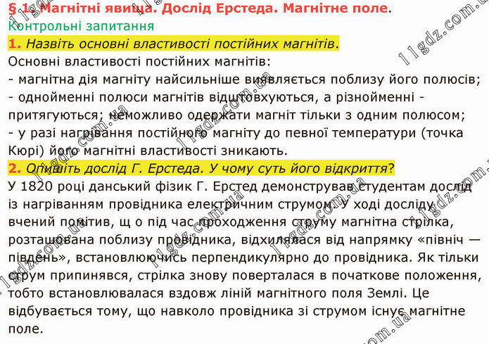 Назвіть основні властивості постійних магнітів. Основні властивості постійних магнітів: - магнітна дія магніту найсильніше виявляється поблизу його полюсів; - однойменні полюси магнітів відштовхуються, а різнойменні - притягуються; неможливо одержати магніт тільки з одним полюсом; - у разі нагрівання постійного магніту до певної температури (точка Кюрі) його магнітні властивості зникають. 2. Опишіть дослід Г. Ерстеда. У чому суть його відкриття? У 1820 році данський фізик Г. Ерстед демонстрував студентам дослід із нагріванням провідника електричним струмом. У ході досліду вчений помітив, щ о під час проходження струму магнітна стрілка, розташована поблизу провідника, відхилялася від напрямку «північ — південь», встановлюючись перпендикулярно до провідника. Як тільки струм припинявся, стрілка знову поверталася в початкове положення, тобто встановлювалася вздовж ліній магнітного поля Землі. Це відбувається тому, що навколо провідника зі струмом існує магнітне поле.