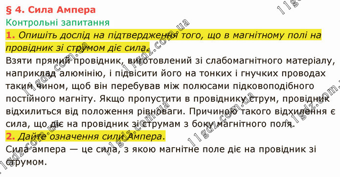 Опишіть дослід на підтвердження того, що в магнітному полі на провідник зі струмом діє сила. Взяти прямий провідник, виготовлений зі слабомагнітного матеріалу, наприклад алюмінію, і підвісити його на тонких і гнучких проводах таким чином, щоб він перебував між полюсами підковоподібного постійного магніту. Якщо пропустити в провіднику струм, провідник відхилиться від положення рівноваги. Причиною такого відхилення є сила, що діє на провідник зі струмам з боку магнітного поля. 2. Дайте означення сили Ампера. Сила ампера — це сила, з якою магнітне поле діє на провідник зі струмом.