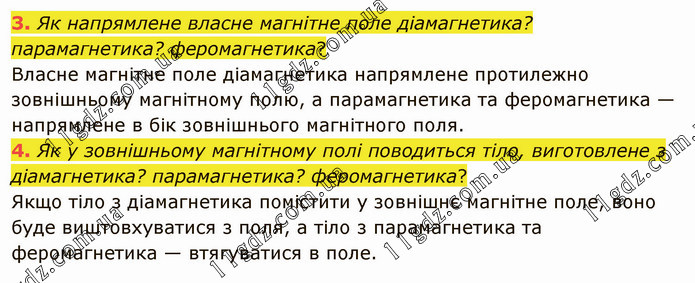 Як напрямлене власне магнітне поле діамагнетика? парамагнетика? феромагнетика? Власне магнітне поле діамагнетика напрямлене протилежно зовнішньому магнітному полю, а парамагнетика та феромагнетика — напрямлене в бік зовнішнього магнітного поля. 4. Як у зовнішньому магнітному полі поводиться тіло, виготовлене з діамагнетика? парамагнетика? феромагнетика? Якщо тіло з діамагнетика помістити у зовнішнє магнітне поле, воно буде виштовхуватися з поля, а тіло з парамагнетика та феромагнетика — втягуватися в поле.