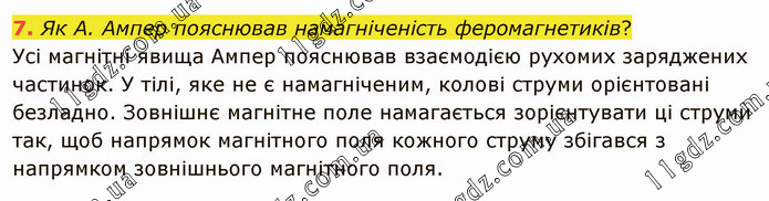 Як А. Ампер пояснював намагніченість феромагнетиків? Усі магнітні явища Ампер пояснював взаємодією рухомих заряджених частинок. У тілі, яке не є намагніченим, колові струми орієнтовані безладно. Зовнішнє магнітне поле намагається зорієнтувати ці струми так, щоб напрямок магнітного поля кожного струму збігався з напрямком зовнішнього магнітного поля.
