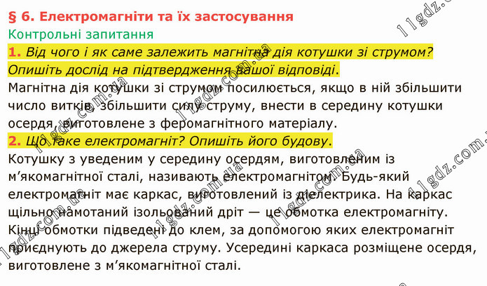 Від чого і як саме залежить магнітна дія котушки зі струмом? Опишіть дослід на підтвердження вашої відповіді. Магнітна дія котушки зі струмом посилюється, якщо в ній збільшити число витків, збільшити силу струму, внести в середину котушки осердя, виготовлене з феромагнітного матеріалу. 2. Що таке електромагніт? Опишіть його будову. Котушку з уведеним у середину осердям, виготовленим із м’якомагнітної сталі, називають електромагнітом. Будь-який електромагніт має каркас, виготовлений із діелектрика. На каркас щільно намотаний ізольований дріт — це обмотка електромагніту. Кінці обмотки підведені до клем, за допомогою яких електромагніт приєднують до джерела струму. Усередині каркаса розміщене осердя, виготовлене з м’якомагнітної сталі.