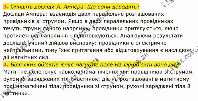 Опишіть досліди А. Ампера. Що вони доводять? Досліди Ампера: взаємодія двох паралельно розташованих провідників зі струмом. Якщо в двох паралельних провідниках течуть струми одного напрямку, провідники притягуються, якщо протилежних напрямків - відштовхуються. Аналізуючи результати дослідів, учений дійшов висновку: провідники є електрично нейтральними, тому їхнє притягання або відштовхування є наслідком дії магнітних сил. 4. Біля яких об’єктів існує магнітне поле На які об’єкти воно діє? Магнітне поле існує навколо намагнічених тіл, провідників зі струмом, рухомих заряджених тіл і частинок; діє на розташовані в магнітному полі намагнічені тіла, провідники зі струмом, рухомі заряджені тіла й частинки.