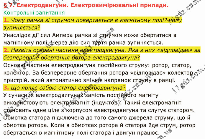 Чому рамка зі струмом повертається в магнітному полі? чому зупиняється? Унаслідок дії сил Ампера рамка зі струмом може обертатися в магнітному полі. Через дію сил тертя рамка зупиняється. 2. Назвіть основні частини електродвигуна. Яка з них «відповідає» за безперервне обертання ротора електродвигуна? Основні частини електродвигуна постійного струму: ротор, статор, колектор. За безперервне обертання ротора «відповідає» колектор - пристрій, який автоматично змінює напрямок струму в рамці. 3. Що являє собою статор електродвигуна? У сучасних електродвигунах замість постійного магніту використовують електромагніт (індуктор). Такий електромагніт становить одне ціле з корпусом електродвигуна та слугує статором. Обмотка статора підключена до того самого джерела струму, що й обмотка ротора. Коли в обмотках ротора й статора йде струм, ротор обертається в магнітному полі статора і двигун працює.