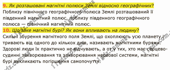 Як розташовані магнітні полюси Землі відносно географічних? Поблизу північного географічного полюса Землі розташований її південний магнітний полюс, поблизу південного географічного полюса — північний магнітний полюс. 10. Що таке магнітні бурі? Як вони впливають на людину? Сильні збурення магнітного поля Землі, що охоплюють усю планету і тривають від одного до кількох днів, називають магнітними бурями. Здорові люди їх практично не відчувають, а от у тих, хто має серцево-судинні захворювання та захворювання нервової системи, магнітні бурі викликають погіршення самопочуття.