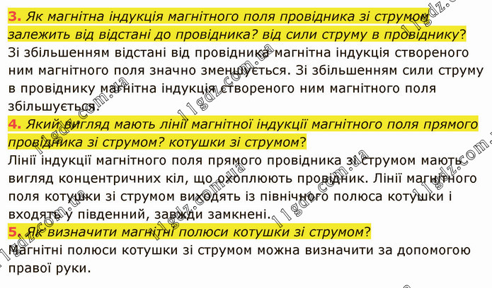 Як магнітна індукція магнітного поля провідника зі струмом залежить від відстані до провідника? від сили струму в провіднику? Зі збільшенням відстані від провідника магнітна індукція створеного ним магнітного поля значно зменшується. Зі збільшенням сили струму в провіднику магнітна індукція створеного ним магнітного поля збільшується. 4. Який вигляд мають лінії магнітної індукції магнітного поля прямого провідника зі струмом? котушки зі струмом? Лінії індукції магнітного поля прямого провідника зі струмом мають вигляд концентричних кіл, що охоплюють провідник. Лінії магнітного поля котушки зі струмом виходять із північного полюса котушки і входять у південний, завжди замкнені. 5. Як визначити магнітні полюси котушки зі струмом? Магнітні полюси котушки зі струмом можна визначити за допомогою правої руки.