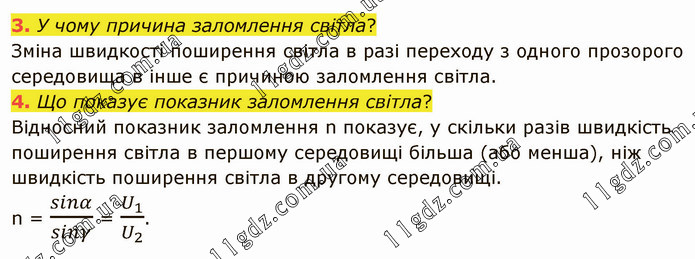 У чому причина заломлення світла? Зміна швидкості поширення світла в разі переходу з одного прозорого середовища в інше є причиною заломлення світла. 4. Що показує показник заломлення світла? Відносний показник заломлення n показує, у скільки разів швидкість поширення світла в першому середовищі більша (або менша), ніж швидкість поширення світла в другому середовищі.