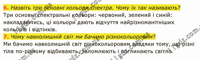 Назвіть три основні кольори спектра. Чому їх так називають? Три основні спектральні кольори: червоний, зелений і синій: накладаючись, ці кольори дають відчуття найрізноманітніших кольорів і відтінків. 7. Чому навколишній світ ми бачимо різнокольоровим? Ми бачимо навколишній світ різнокольоровим завдяки тому, що різні тіла по-різному відбивають, заломлюють і поглинають світло.