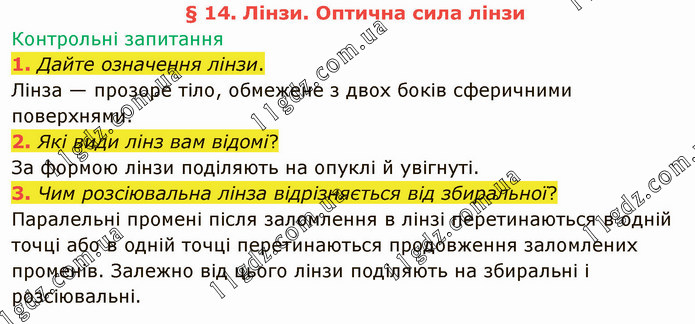 Дайте означення лінзи. Лінза — прозоре тіло, обмежене з двох боків сферичними поверхнями. 2. Які види лінз вам відомі? За формою лінзи поділяють на опуклі й увігнуті. 3. Чим розсіювальна лінза відрізняється від збиральної? Паралельні промені після заломлення в лінзі перетинаються в одній точці або в одній точці перетинаються продовження заломлених променів. Залежно від цього лінзи поділяють на збиральні і розсіювальні.