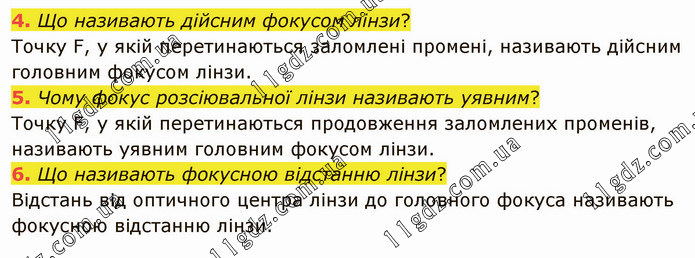 Що називають дійсним фокусом лінзи? Точку F, у якій перетинаються заломлені промені, називають дійсним головним фокусом лінзи. 5. Чому фокус розсіювальної лінзи називають уявним? Точку F, у якій перетинаються продовження заломлених променів, називають уявним головним фокусом лінзи. 6. Що називають фокусною відстанню лінзи? Відстань від оптичного центра лінзи до головного фокуса називають фокусною відстанню лінзи.