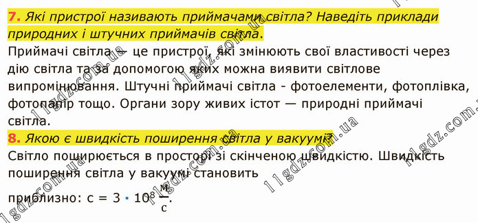 Які пристрої називають приймачами світла? Наведіть приклади природних і штучних приймачів світла. Приймачі світла — це пристрої, які змінюють свої властивості через дію світла та за допомогою яких можна виявити світлове випромінювання. Штучні приймачі світла - фотоелементи, фотоплівка, фотопапір тощо. Органи зору живих істот — природні приймачі світла. 8. Якою є швидкість поширення світла у вакуумі? Світло поширюється в просторі зі скінченою швидкістю. Швидкість поширення світла у вакуумі становить приблизно: с = 3 ∙ 108 м/с.