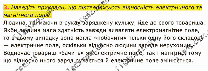 Наведіть приклади, що підтверджують відносність електричного та магнітного полів. Людина, тримаючи в руках заряджену кульку, йде до свого товариша. Якби людина мала здатність завжди виявляти електромагнітне поле, то в цьому випадку вона могла «побачити» тільки одну його складову — електричне поле, оскільки відносно людини заряде нерухомим. Водночас товариш «бачить» як електричне поле, так і магнітне, тому що відносно нього заряд рухається й електричне поле змінюється.
