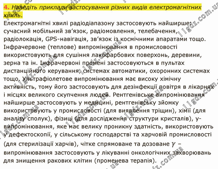 Наведіть приклади застосування різних видів електромагнітних хвиль. Електромагнітні хвилі радіодіапазону застосовують найширше: сучасний мобільний зв’язок, радіомовлення, телебачення, радіолокація, GPS-навігація, зв’язок із космічними апаратами тощо. Інфрачервоне (теплове) випромінювання в промисловості використовують для сушіння лакофарбових поверхонь, деревини, зерна та ін. Інфрачервоні промені застосовуються в пультах дистанційного керування, системах автоматики, охоронних системах тощо. Ультрафіолетове випромінювання має високу хімічну активність, тому його застосовують для дезінфекції повітря в лікарнях і місцях великого скупчення людей. Рентгенівське випромінювання найширше застосовують у медицині, рентгенівську зйомку використовують у промисловості (для виявлення тріщин), хімії (для аналізу сполук), фізиці (для дослідження структури кристалів), у-випромінювання, яке має велику проникну здатність, використовують у дефектоскопії, у сільському господарстві та харчовій промисловості (для стерилізації харчів), чітке спрямоване та дозоване γ –випромінювання застосовують у лікуванні онкологічних захворювань для знищення ракових клітин (променева терапія).