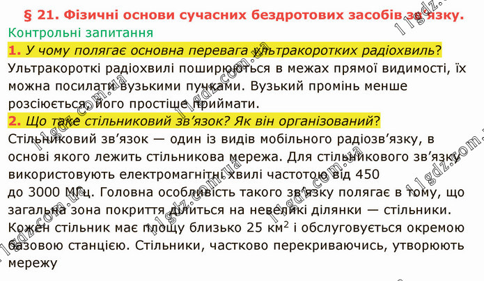 У чому полягає основна перевага ультракоротких радіохвиль? Ультракороткі радіохвилі поширюються в межах прямої видимості, їх можна посилати вузькими пучками. Вузький промінь менше розсіюється, його простіше приймати. 2. Що таке стільниковий зв’язок? Як він організований? Стільниковий зв’язок — один із видів мобільного радіозв’язку, в основі якого лежить стільникова мережа. Для стільникового зв’язку використовують електромагнітні хвилі частотою від 450 до 3000 МГц. Головна особливість такого зв’язку полягає в тому, що загальна зона покриття ділиться на невеликі ділянки — стільники. Кожен стільник має площу близько 25 км2 і обслуговується окремою базовою станцією. Стільники, частково перекриваючись, утворюють мережу