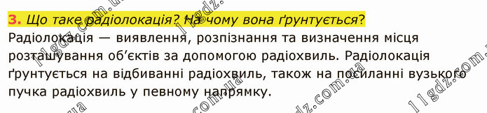 Що таке радіолокація? На чому вона ґрунтується? Радіолокація — виявлення, розпізнання та визначення місця розташування об’єктів за допомогою радіохвиль. Радіолокація ґрунтується на відбиванні радіохвиль, також на посиланні вузького пучка радіохвиль у певному напрямку.