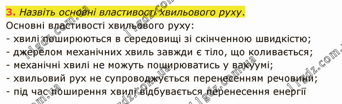 Назвіть основні властивості хвильового руху. Основні властивості хвильового руху: - хвилі поширюються в середовищі зі скінченною швидкістю; - джерелом механічних хвиль завжди є тіло, що коливається; - механічні хвилі не можуть поширюватись у вакуумі; - хвильовий рух не супроводжується перенесенням речовини; - під час поширення хвилі відбувається перенесення енергії