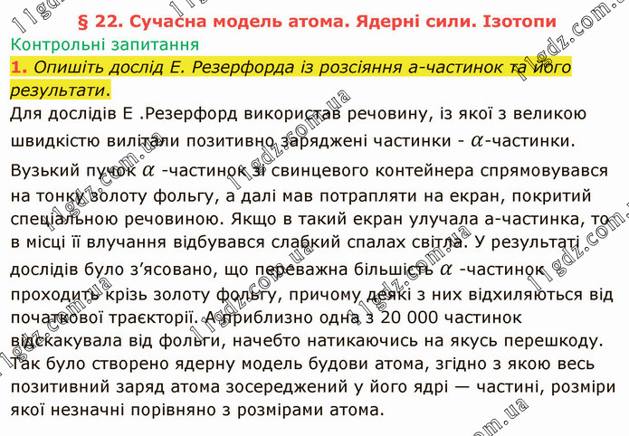 Опишіть дослід Е. Резерфорда із розсіяння а-частинок та його результати. Для дослідів Е .Резерфорд використав речовину, із якої з великою швидкістю вилітали позитивно заряджені частинки - α-частинки. Вузький пучок α -частинок зі свинцевого контейнера спрямовувався на тонку золоту фольгу, а далі мав потрапляти на екран, покритий спеціальною речовиною. Якщо в такий екран улучала а-частинка, то в місці її влучання відбувався слабкий спалах світла. У результаті дослідів було з’ясовано, що переважна більшість α -частинок проходить крізь золоту фольгу, причому деякі з них відхиляються від початкової траєкторії. А приблизно одна з 20 000 частинок відскакувала від фольги, начебто натикаючись на якусь перешкоду. Так було створено ядерну модель будови атома, згідно з якою весь позитивний заряд атома зосереджений у його ядрі — частині, розміри якої незначні порівняно з розмірами атома.