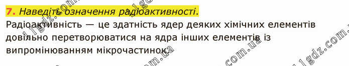 Наведіть означення радіоактивності. Радіоактивність — це здатність ядер деяких хімічних елементів довільно перетворюватися на ядра інших елементів із випромінюванням мікрочастинок.