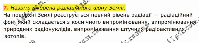 Назвіть джерела радіаційного фону Землі. На поверхні Землі реєструється певний рівень радіації — радіаційний фон, який складається з космічного випромінювання, випромінювання природних радіонуклідів, випромінювання штучних радіоактивних ізотопів.
