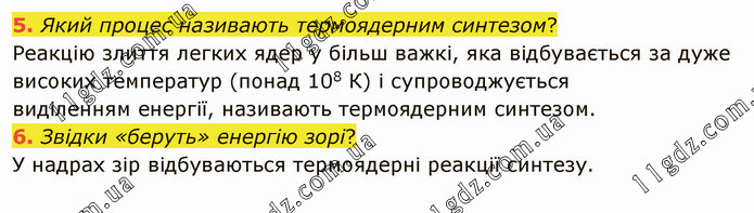 Який процес називають термоядерним синтезом? Реакцію злиття легких ядер у більш важкі, яка відбувається за дуже високих температур (понад 108 К) і супроводжується виділенням енергії, називають термоядерним синтезом. 6. Звідки «беруть» енергію зорі? У надрах зір відбуваються термоядерні реакції синтезу.