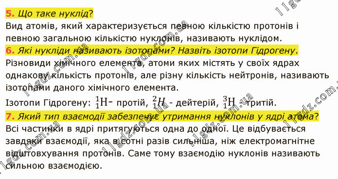 Що таке нуклід? Вид атомів, який характеризується певною кількістю протонів і певною загальною кількістю нуклонів, називають нуклідом. 6. Які нукліди називають ізотопами? Назвіть ізотопи Гідрогену. Різновиди хімічного елемента, атоми яких містять у своїх ядрах однакову кількість протонів, але різну кількість нейтронів, називають ізотопами даного хімічного елемента. Ізотопи Гідрогену: (_1^1)H- протій, (_1^2)H - дейтерій, (_1^3)H - тритій. 7. Який тип взаємодії забезпечує утримання нуклонів у ядрі атома? Всі частинки в ядрі притягуються одна до одної. Це відбувається завдяки взаємодії, яка в сотні разів сильніша, ніж електромагнітне відштовхування протонів. Саме тому взаємодію нуклонів називають сильною взаємодією.