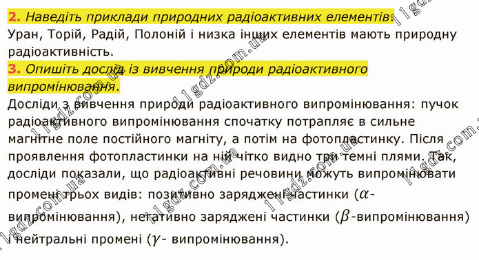 Наведіть приклади природних радіоактивних елементів. Уран, Торій, Радій, Полоній і низка інших елементів мають природну радіоактивність. 3. Опишіть дослід із вивчення природи радіоактивного випромінювання. Досліди з вивчення природи радіоактивного випромінювання: пучок радіоактивного випромінювання спочатку потрапляє в сильне магнітне поле постійного магніту, а потім на фотопластинку. Після проявлення фотопластинки на ній чітко видно три темні плями. Так, досліди показали, що радіоактивні речовини можуть випромінювати промені трьох видів: позитивно заряджені частинки (α-випромінювання), негативно заряджені частинки (β-випромінювання) і нейтральні промені (γ- випромінювання).