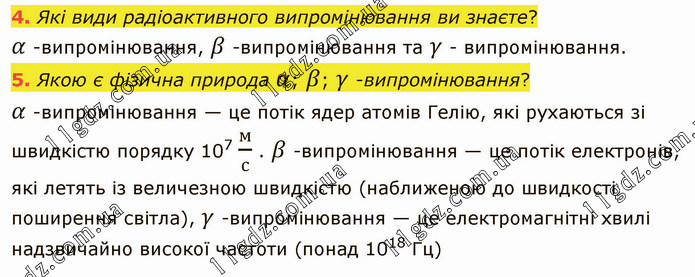 Які види радіоактивного випромінювання ви знаєте? α -випромінювання, β -випромінювання та γ - випромінювання. 5. Якою є фізична природа α; β; γ -випромінювання? α -випромінювання — це потік ядер атомів Гелію, які рухаються зі швидкістю порядку 107 м/с . β -випромінювання — це потік електронів, які летять із величезною швидкістю (наближеною до швидкості поширення світла), γ -випромінювання — це електромагнітні хвилі надзвичайно високої частоти (понад 1018 Гц)