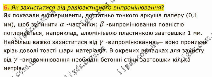 Як захиститися від радіоактивного випромінювання? Як показали експерименти, достатньо тонкого аркуша паперу (0,1 мм), щоб зупинити α -частинки; β -випромінювання повністю поглинається, наприклад, алюмінієвою пластинкою завтовшки 1 мм. Найбільш важко захиститися від γ -випромінювання — воно проникає крізь доволі товсті шари матеріалів. В окремих випадках для захисту від γ -випромінювання необхідні бетонні стіни завтовшки кілька метрів.