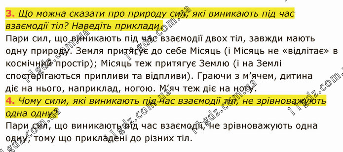 Що можна сказати про природу сил, які виникають під час взаємодії тіл? Наведіть приклади. Пари сил, що виникають під час взаємодії двох тіл, завжди мають одну природу. Земля притягує до себе Місяць (і Місяць не «відлітає» в космічний простір); Місяць теж притягує Землю (і на Землі спостерігаються припливи та відпливи). Граючи з м’ячем, дитина діє на нього, наприклад, ногою. М’яч теж діє на ногу. 4. Чому сили, які виникають під час взаємодії тіл, не зрівноважують одна одну? Пари сил, що виникають під час взаємодії, не зрівноважують одна одну, тому що прикладені до різних тіл.
