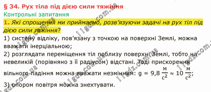 Які спрощення ми приймаємо, розв’язуючи задачі на рух тіл під дією сили тяжіння? 1) систему відліку, пов’язану з точкою на поверхні Землі, можна вважати інерціальною; 2) розглядати переміщення тіл поблизу поверхні Землі, тобто на невеликій (порівняно з її радіусом) відстані. Тоді прискорення вільного падіння можна вважати незмінним: g = 9,8 м/с^2 ≈ 10 м/с^2 ; 3) опором повітря можна знехтувати.