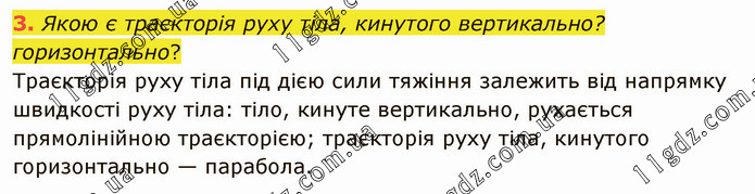 Якою є траєкторія руху тіла, кинутого вертикально? горизонтально? Траєкторія руху тіла під дією сили тяжіння залежить від напрямку швидкості руху тіла: тіло, кинуте вертикально, рухається прямолінійною траєкторією; траєкторія руху тіла, кинутого горизонтально — парабола.