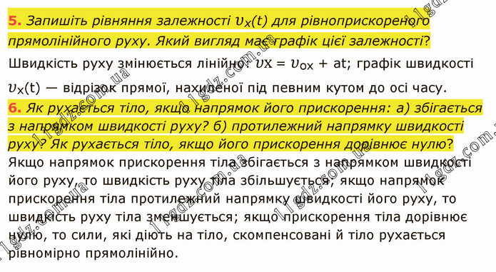 Запишіть рівняння залежності υх(t) для рівноприскореного прямолінійного руху. Який вигляд має графік цієї залежності? Швидкість руху змінюється лінійно: υх = υoх + аt; графік швидкості υх(t) — відрізок прямої, нахиленої під певним кутом до осі часу. 6. Як рухається тіло, якщо напрямок його прискорення: а) збігається з напрямком швидкості руху? б) протилежний напрямку швидкості руху? Як рухається тіло, якщо його прискорення дорівнює нулю? Якщо напрямок прискорення тіла збігається з напрямком швидкості його руху, то швидкість руху тіла збільшується; якщо напрямок прискорення тіла протилежний напрямку швидкості його руху, то швидкість руху тіла зменшується; якщо прискорення тіла дорівнює нулю, то сили, які діють на тіло, скомпенсовані й тіло рухається рівномірно прямолінійно.